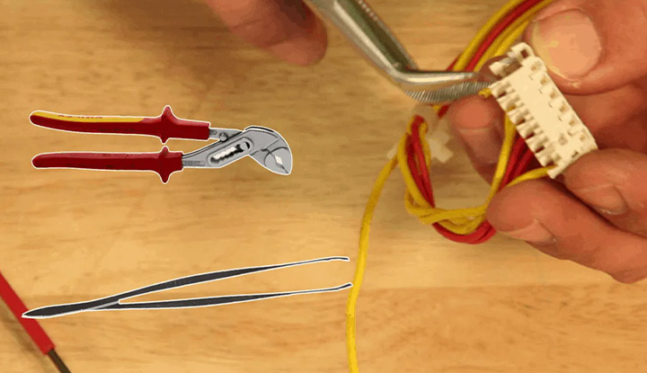 • À présent, il faut extraire ce bout de fil. À l’aide d’une pince à bec, d’une pince multiprises ou d’une pince à épiler, tirez sur le câble pour le déloger.